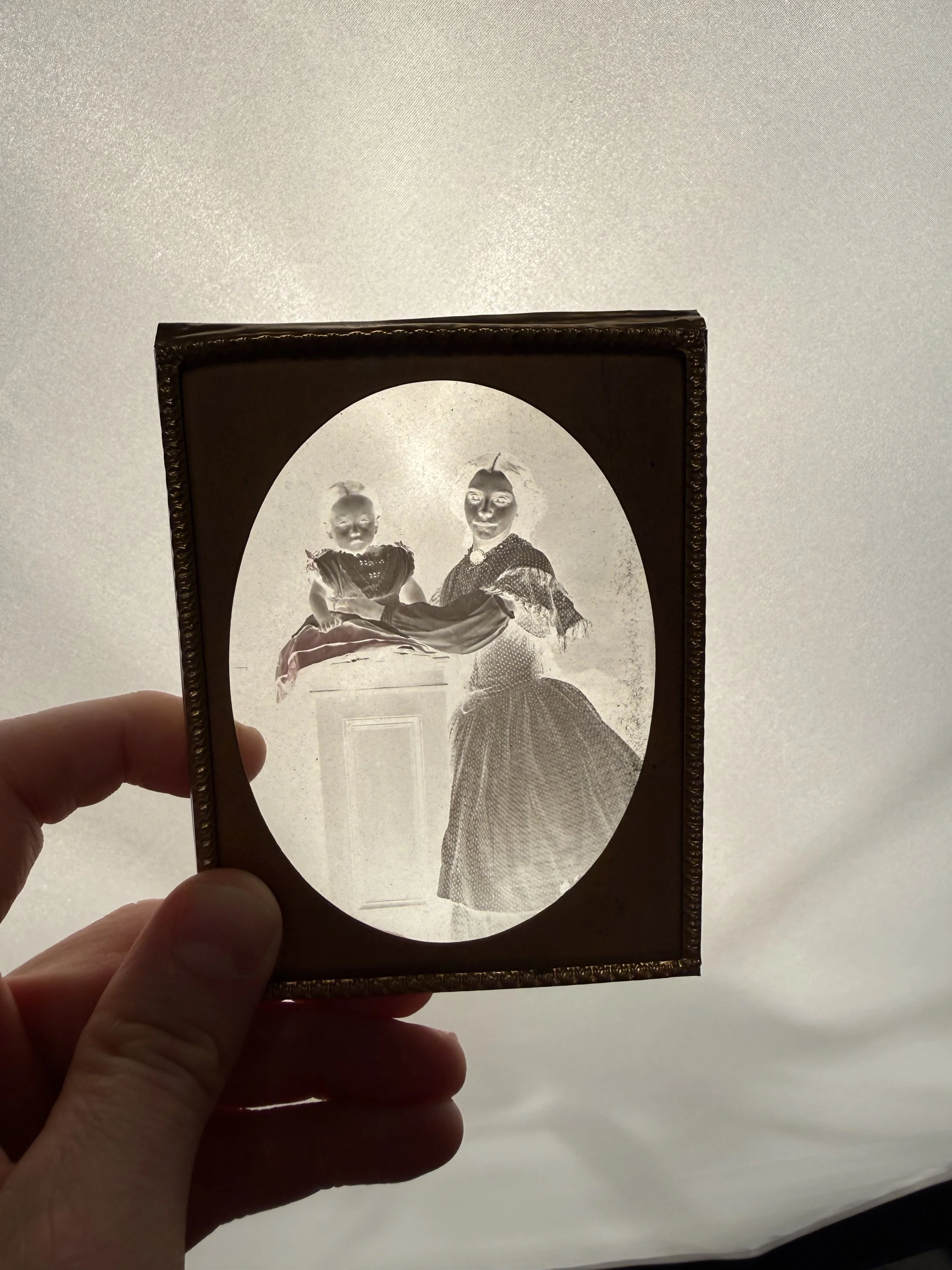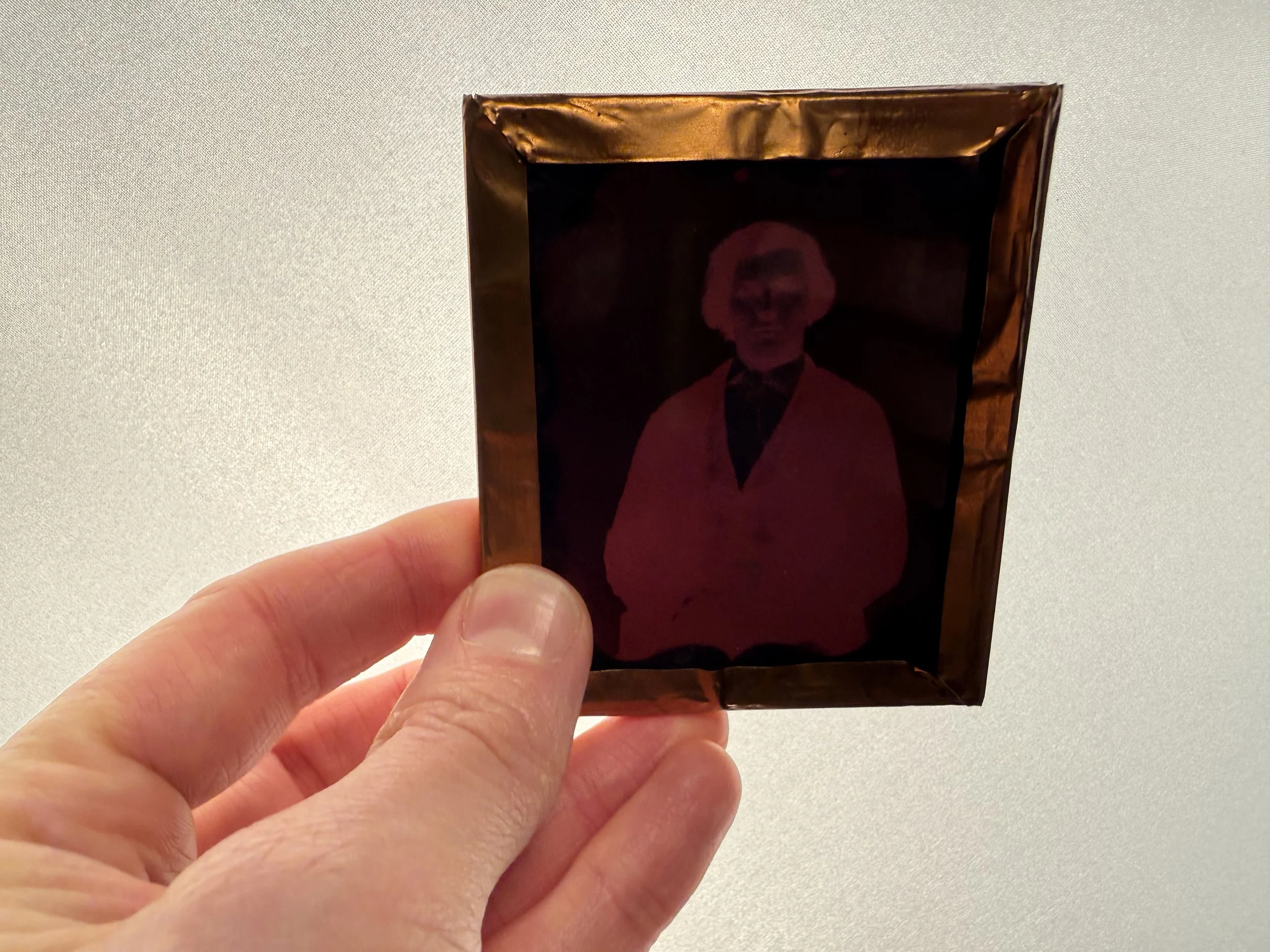 What you end up with is an image made of mercury-silver amalgam sitting on a mirror-like surface. And that mirror quality is what makes daguerreotypes so distinctive and so difficult to photograph or reproduce. You have to hold one in your hand and tilt it to see the image properly. At one angle, it looks like a positive. Tilt it another way and it flips to a negative, or catches the light and becomes a mirror reflecting your own face back at you. There's nothing else in photography quite like it.