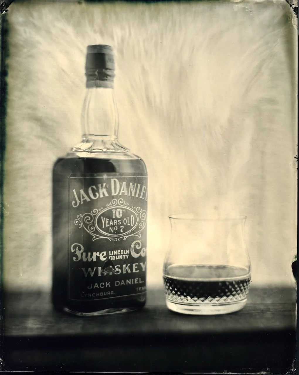 The subject of the shoot was not just any bottle. It was an original archival Jack Daniel’s Ten Year Old, unopened and possibly one-of-a-kind. Because of its historical value, I handled it with extreme care. Using the wet plate collodion process, I created a series of tintypes, each one a direct positive on metal.